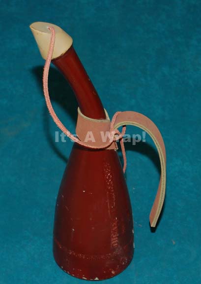 Description: A prop item similar to those featured throughout the Star Trek episodic television pantheon. This prop item is a bottle of Saurian brandy; it is deep red in color, the general shape of a regular wine if the neck had been bent to the side, a strap of leather cord glued to the side and a tan “cork” in the top. The bottle has a height of approx. 14 inches and a diameter of approx. 4 inches.