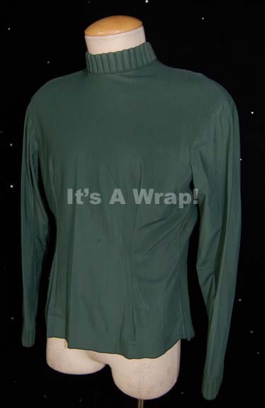 Description: A costume element featured in the third Star Trek feature film “The Search for Spock” for wear by phaser armor security division officers. This item is a long-sleeved, Starfleet uniform undershirt in forest green for the Security division, with a trapunto-style collar, and zip up the back. The item is made for male wearers. A sewn in Paramount tag reads ‘M 42’.
