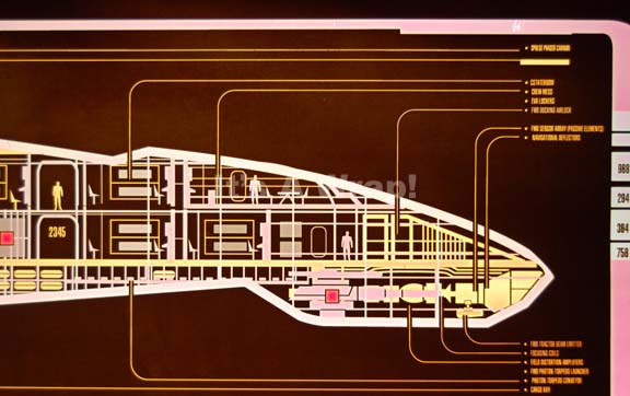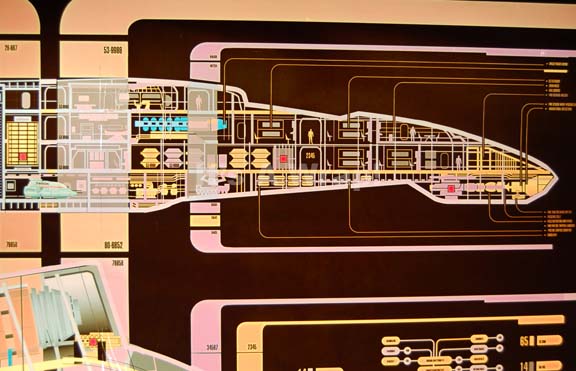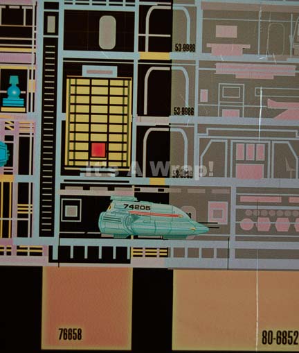 Description: A large LCARS (Library Computer Access and Retrieval) panel graphic used in the engineering set of the “U.S.S. Valiant” on the Star Trek: Deep Space Nine episode “Valiant”. The item is a large translate graphical application depicting interior ship schematics and cross sections of the Defiant-Class starship. It appeared in a scene taking place between “Nog” (Aaron Eisenberg) and “Jake Sisko” (Cirroc Lofton) The graphic is multi-colored and features two small dorsal views of the ship with various highlighted sections, a larger dorsal view of half of the ship that features positions of the sickbay, galley, bridge, engineering, and weapons emplacements, and a cross section from the side of the ship which locates the main shuttlebay with a shuttle in it, the location of main engineering, and the bridge. The display is inscribed ‘Master Systems Display II’ and ‘NCC-74210’. The item is best viewed when back lit by an external light source. The item measures approx. 38.25 X 68.25 inches but will ship rolled.