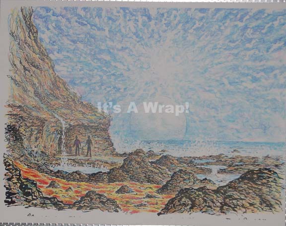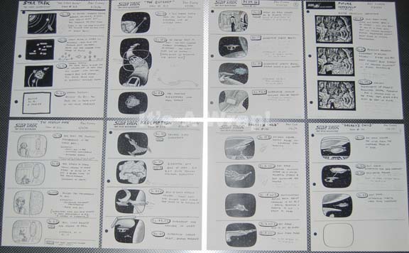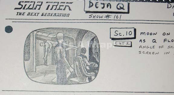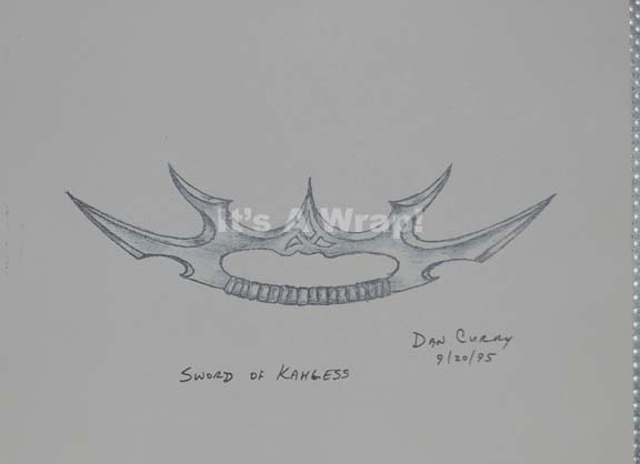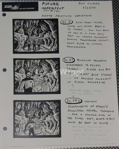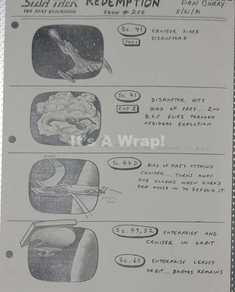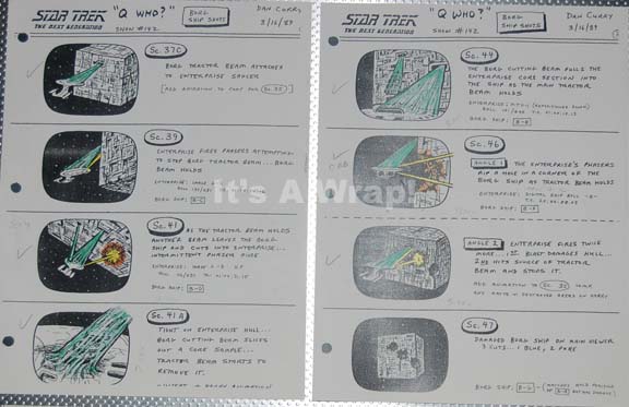 Description: A lot of Dan Curry concept sketches and storyboards created variously for episodes of Star Trek: The Next Generation and Deep Space Nine. The lot consists of thirty-eight black and white and color duplicates on white paper all located together, and three sketches on 11 X 17 inch white paper folded in half to match the size. The storyboard s depict multiple special effects shots from episodes like “Redemption”, “The Perfect Mate”, “Galaxy’s Child” , “The Outcast”, “The First Duty”, “Future Imperfect”, “Deja Q”, and “Q-Who”. The storyboards depict various usages of starship models and motion control on screen. The sheets all feature dates, show numbers, titles, and ‘Dan Curry’ written on them. Another selection includes sketches of various prop weapons designed by Curry for the series including the ‘Tilonian’ dagger from “Frame of Mind”, a selection of ‘primitive weapons’, the “Sword of Kahless” from the episode of the same name, and others. Color renderings of the space borne entity from “Galaxy’s Child” are present as well as landscape scenes including “Captain Picard” and “Q” standing on primordial Earth while the anti-time anomaly is visible in the sky form “All Good Things…”