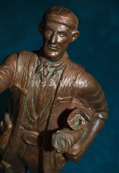 Description: ” A molded resin set dressing statue of the famous human scientist who invented warp flight, “Zephram Cochrane”. The item is positioned on a sturdy molded resin base colored to appear as marble and the statue itself is painted to appear as though it is made from bronze and aged to appear realistic. The likeness matches that of acclaimed Academy Award winning actor James Cromwell following his performance in Star Trek VIII: First Contact. An item like this appeared on the crew quarters desk shelving of “Captain Archer” (Scott Bakula) in multiple episodes of Star Trek: Enterprise. The item depicts the inventor in his costume from Star Trek VIII holding rolled design schematics in his left hand, while pointing ahead of himself with his first and middle fingers reminiscent of the gesture used by “Captain Picard” (Patrick Stewart). The item measures approx. 16 X 5.25 X 7, the base of the item measures approx. 7.75 inches diameter. This excellent representation is the last known remaining item in this configuration.