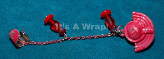Description: A pair of costume accessories featured in the Star Trek: Deep Space Nine episode “Covenant” for wear by followers of “Dukat’s” (Marc Alaimo) cult of the pah wraiths. The items are an armband and earring, both colored red to fit the theme. The earring is metal with a traditional Bajoran appearance and translucent plastic beads with a clasp lobe holder, and the arm band is cotton with a knot at one end to appear tied, though the item fits on the arm with the use of size adjusting Velcro. An ‘S’ is inscribed at the end believed to mean ‘small’. The earring was located in a plastic zip bag labeled ‘Frank DiResta’.