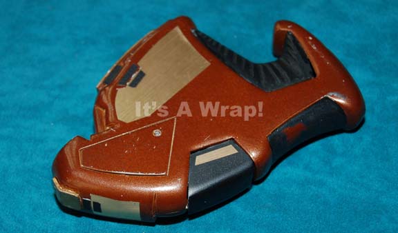 Description: A hand prop item believed to have appeared in episodes of Star Trek: Deep Space Nine. The item is injection molded plastic with currently non-functional internal electronics believed to power several LEDs. The item features an activation switch on one end and metallic gold colored accents generally. A battery housing is present internally that fits an ‘N’ sized battery. The item measures approx. 5.25 X 7.75 X 0.75 inches.