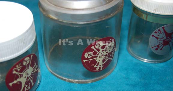 Description: A lot of three clear set dressing jars made with Cardassian graphical applications believed to have appeared in the Infirmary set in episodes of Star Trek: Deep Space Nine. Two of the items are ‘found’ props, functional plastic jars with white screw lid caps, the third is a clear acrylic jar with a molded resin lid painted metallic silver. The jars measure approx. 2.75 X 2.75 inches diameter, 3 X 2.5 inches diameter, and 3.5 X 3 inches diameter. Items like this appeared on the desk of “Arik Soong” (Brent Spiner) in the Star Trek: Enterprise episode “The Augments”.