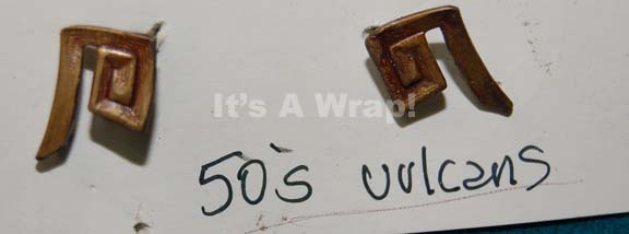 Description: A pair of costume accents featured in the Star Trek: Enterprise episode “Carbon Creek”; wherein three Vulcans are stranded in a mid-twentieth century, Pennsylvania mining town and are forced to interact with the denizens of that town while they wait to be rescued. These items are rank pins for mid-twentieth century Vulcan uniforms; resin-cast, copper-colored pins made in a spiral pattern with tines to poke through and bend to hold the pin in place.