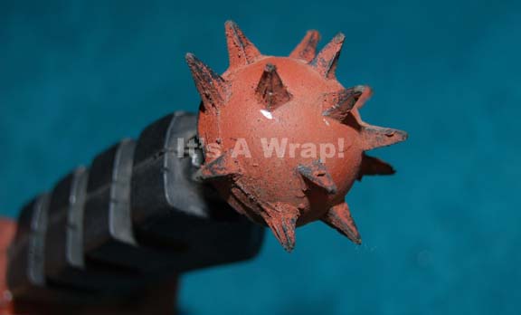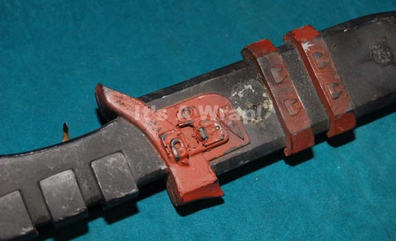 Description: A Klingon knife made for use in Star Trek episodic television. Made of foam rubber the knife is painted black and brown, has faux spikes at the top of the hilt, many textured along the front and back, a small Klingon symbol belonging near the bottom has been removed, and on the reverse side, metal clips for attaching the knife to a costume. The item show minor wear and measures approx. 14 x 3 x 1.5 inches.