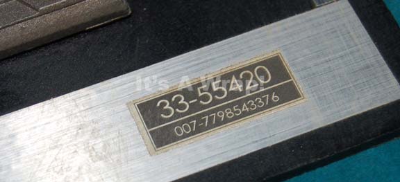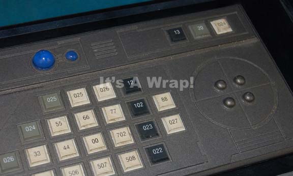 Description: A prop computer keyboard interface like those appearing variously in episodes of Star Trek: Enterprise. The item is molded resin with multicolored, rubber faux buttons with numerical values adhered across its surface, molded to present several raised features, two blue, differently-sized, transparent gel domes acting as ‘electric eyes’. This item is mounted on a black base with silver-colored graphical applications added, a small inventory application in the lower right, and has the word ‘Galley’ written directly on the reverse. The item measures approx. 13 X 5.25 X 0.25 inches.