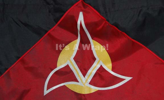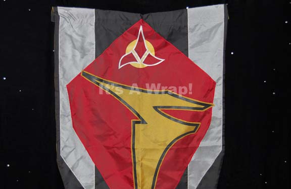 Description: A piece of set dressing like those featured throughout Star Trek episodic television and feature films. This item Is a banner of the Klingon Empire, it is black with silver stripes down the sides, a rough, red, hexagon featuring the Klingon sigil over a yellow circle, and a yellow Klingon glyph edged in black. Secured by Velcro at the top and weighed down at the tip, this item is ready for hanging and measures approx. 66 X 32 inches.
