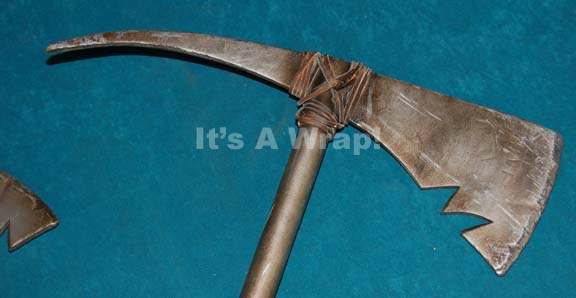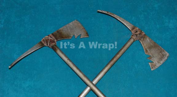 Description: A lot of two prop pickaxes appearing in the Star Trek: Enterprise episode “Judgment” for use by Rura Penthe prison dilithium miners. The items are PVC pipes with molded rubber ‘blades’ affixed to the end that are mounted on an internal metal framework. The item is painted metallic silver and distresses to appear ‘used’. The items measure approx. 30 X 15 inches.