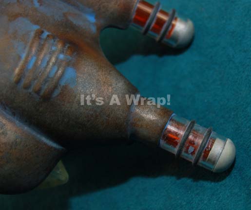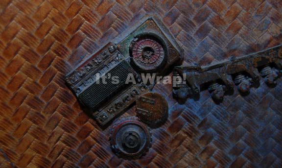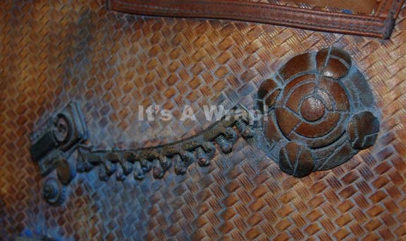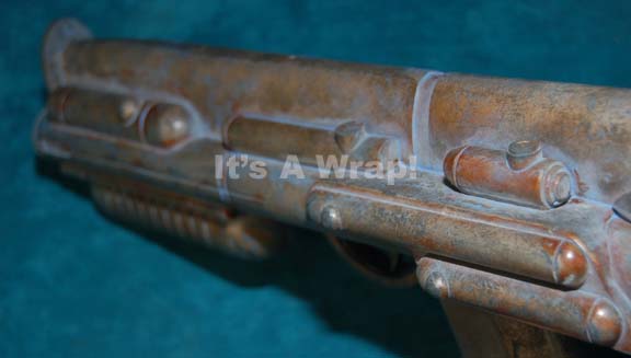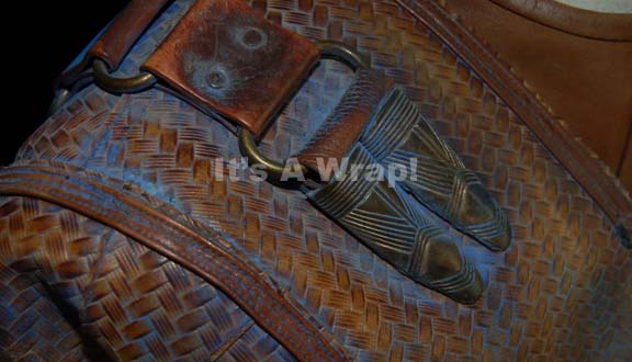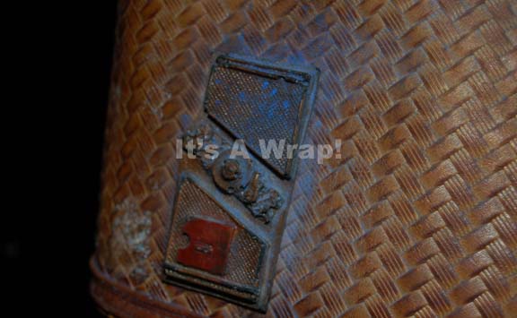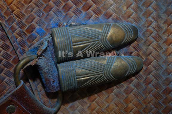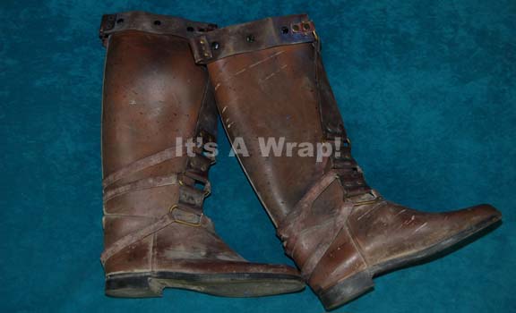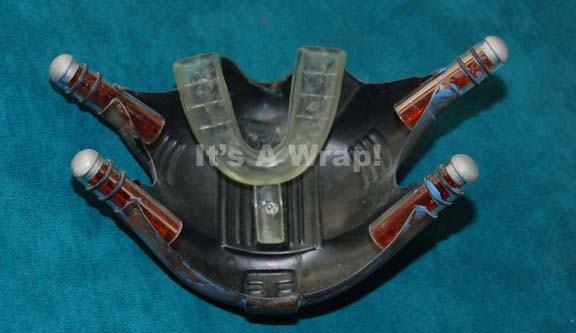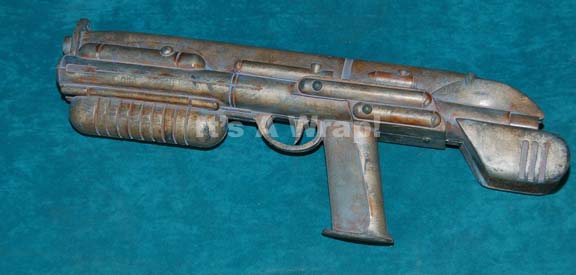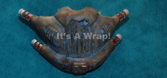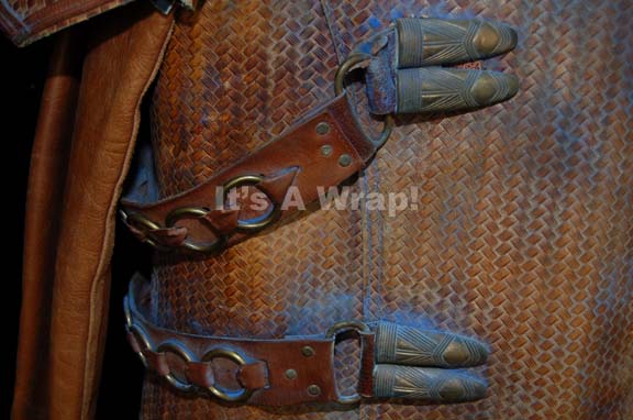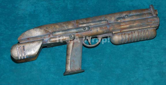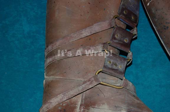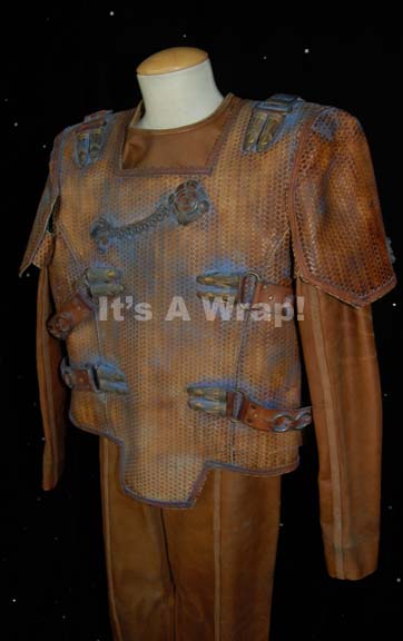 Description: An elaborate and highly detailed leather mine guard costume with a species specific prop weapon featured in the Star Trek: Enterprise episode “The Xindi”. The costume consists of a long sleeved leather undershirt that zips down the spine, and a short-sleeved overcoat with openings for the undershirt sleeves to come through. The overcoat is made of a neoprene interior with braided patterned leather making up its exterior; a zipper seals over the spine. A leather belt attached to the front with metal rings attaches via Velcro at the spine; the overcoat also features other leather and metal details and blue painted “aging” around them. The costume also contains brown leather trousers that fit down into excellently detailed boots. The mine guard prop energy carbine is made from sturdy molded rubber, painted and aged to match the costume and measures approx. 18.5 X 7 X 3.75 inches. A matching plastic ‘breath mask’ for the 'toxic fumes' present in the mine is also included. Multiple sewn in tags and labels read ‘Scott Workman’ or some derivative thereof.
