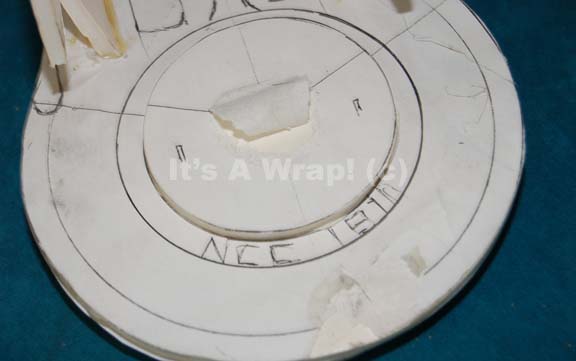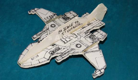 Description: A white foam core fashioned camera test model miniature of “Chakotay’s” (Robert Beltran) “Val-Jean”-type Maquis ship like those appearing in various episodes of Star Trek: Voyager and Star trek: The Next Generation. The item is composed of multiple pieces of fashioned white foam core adhered to one another. The item is adorned with detailed photocopies externally and the wing sections are bent accordingly. An inscription on the port side hull reads ‘In scale to 5’ Voayger’. The item measures approx. 9 X 9 inches.