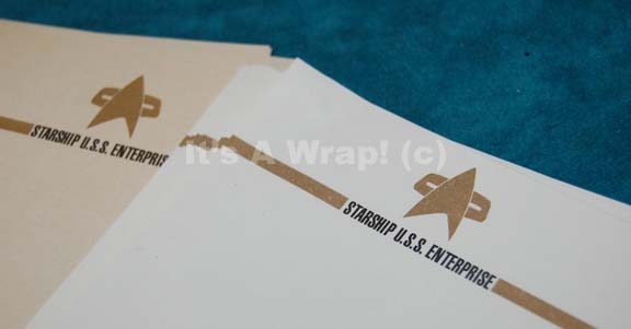 Description: A scratch paper pad like those appearing in a deleted scene titled “Flirting” in Star Trek IX: Insurrection. The scene takes place between “Commander Riker” (Jonathan Frakes) and “Councilor Troi” (Marina Sirtis) in the library set on board the “USS Enterprise-E” and while discussing the Son’a the pair throws waded up sheets of paper at each other. The item is a black plastic container with an open face that allows for multiple sheets of 4 X 6 inch paper to be placed within. It features a metallic silver colored adhesive detail strip running around it with a flip out base to stand the item ergonomically, and rubber feet on bottom for traction against a table. The paper selection is varied with white, tan, and peach hues that are adorned by the modern Starfleet emblem in gold with the inscription ‘Starship U.S.S. Enterprise’ and ‘NCC-1701-E’. The item measures 5.75 X 7.5 X 2 inches. This lot represents the last item of this configuration known to be available.