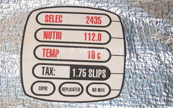 Description: A prop ration pack believed to have been created for episodes of Star Trek: Deep Space Nine. The item is a metallic silver colored fabric pouch with an purple fabric lined interior and a Velcro sealed flap. The face of the item features a graphical application giving numeric information for several listings including ‘Selec’, ‘Nitri’, ‘Temp’, and ‘Tax: 1.75 slips’. Other information like ‘Expir’, ‘Replicated’, and ‘No MSG’ are listed below. The item measures approx. 6 X 6 inches.