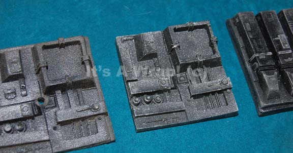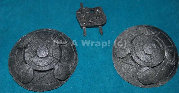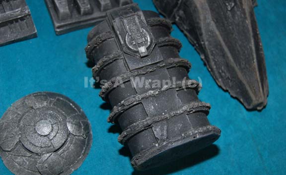 Description: A lot of Jem’Hadar themed costume accessories like those appearing variously in episodes of Star Trek: Deep Space Nine. The items are molded resin and molded rubber and most feature Velcro placements or other fastening elements. Two of the items are disk shaped domes believed to be ‘shaped charges’, another item is believed to be a belt mounted prop grenade . Three square shaped items are present, one molded rubber item appears as a ketricel-white device, and two other technological pieces are present, one molded rubber, the other molded resin. A final item is made for belt mounting. The items measure approx. 6.5 X 4 X 1 inch, and 3 X 3 X 0.75 inches generally.