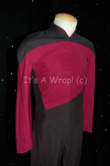Description: A costume featured in various episodes of Star Trek: The Next Generation and Star Trek: Voyager. This costume is a Starfleet uniform jumpsuit featuring black shoulders, a Command Red chest, back, sleeves, and piping around the Mandarin collar; a black waist and legs that end in stirrups. This particular uniform has a zip down the front and features a Velcro patch on the left breast for a commbadge (sold separately). A sewn in Voyager tag reads ‘Jenny Navarro’.