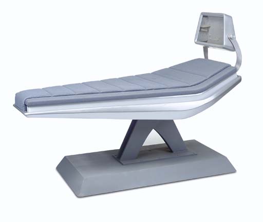 Description: A futuristic pedestal bed with monitor screen shell, resin and glass fiber, wood, and plastic construction, open area in monitor shell is designed for installation of an LCD computer screen [not included], mounted on wheeled rectangular base -- <I>84x61x42in.</I> -- originally made for <I>Star Trek: The Motion Picture</I>, later modified for <I>Star Trek: The Next Generation</I>, then later used on the <I>Enterprise-E</I> in <I>Star Trek: Nemesis</I>