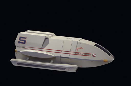 Description: A visual effects model of a <I>The Motion Picture</I>-era <I>Enterprise</I> shuttlecraft, made from cast resin and glass fiber with plastic details, missing left engine pod, windshields, top dome and back panels -- <I>60x27</I> (without engines)<I> x 16in.</I> (without engines) -- used for visual effects filming in <I>Star Trek V: The Final Frontier</I>