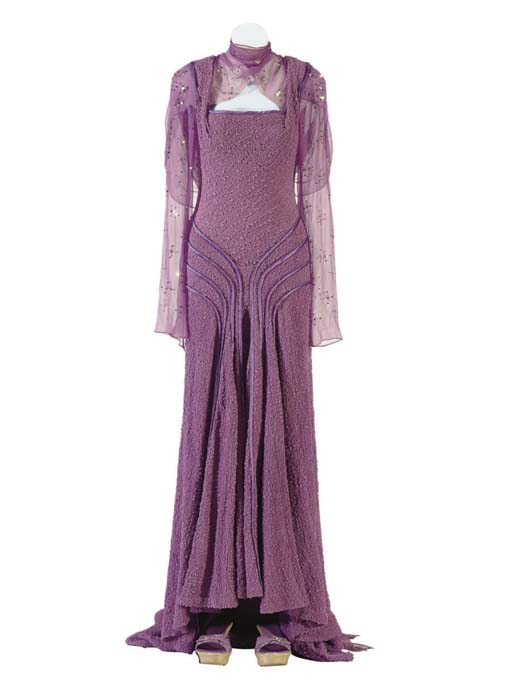 Description: A full-length lavender gown, with lavender chiffon sleeves and neck, with matching chiffon veil; accompanied by a pair of lavender shoes; with corresponding wardrobe tag; a prop book, the red leather binding containing a collection of work by Edgar Allen Poe, stamped on the front in gilt <I>The Teachings Of Surak, Complete And Unabridged, translated from the Vulcan by Skon of Shikahr</I>, with two bound-in prop title pages; and a prop letter in Vulcan script from T'Pol's fiancé -- made for Jolene Blalock as T'Pol in her wedding scene in "Home" in <I>Star Trek: Enterprise</I> (6)