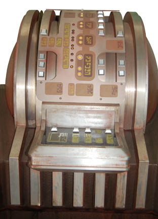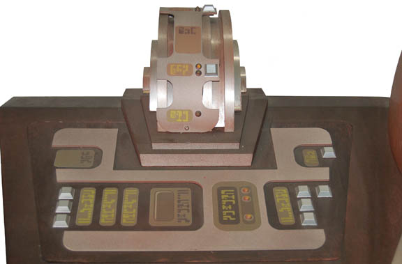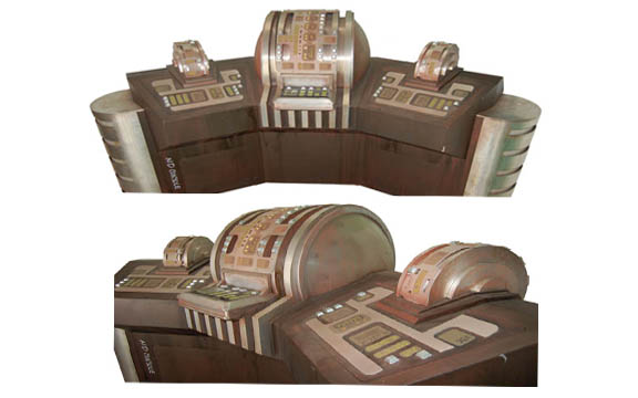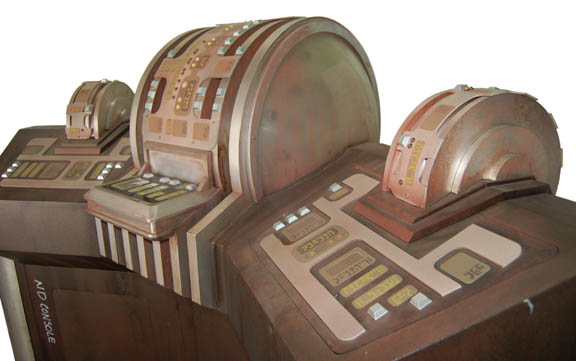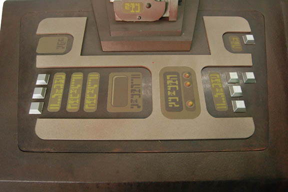 Description: An Orion console used at the Orion Slave Market in the Star Trek: Enterprise episode “Borderland”. It was shot in a scene being operated by Captain Archer (Scott Bakula) and Eric Soong (Brent Spiner). This console is made primarily of wood with metal and plastic attachments. The console has been painted to look like rusted metal. Each bulbous side section has a single row of ten intermittently flashing orange LED lights. The center bulbous section has one row of ten intermittently orange flashing LED lights in the front and ten more at the back. Attached to the console are small, raised simulated rubber buttons (several are missing) along with silver painted square buttons. Painted flat keypads have also been attached for the finished effect. The electrically equipped console is powered by a standard 3-pronged outlet plug on an approximately 5' 3” cable. "ND CONSOLE" has been written on the control side. Console measures approx. 86 x 36 x 50 inches.