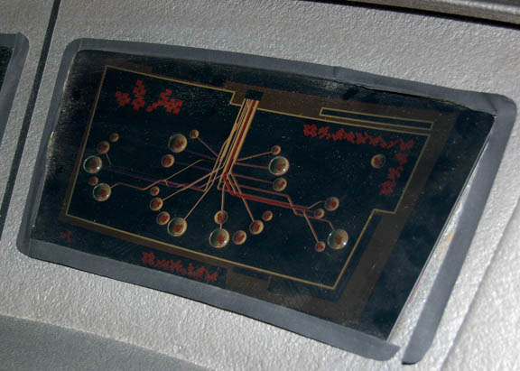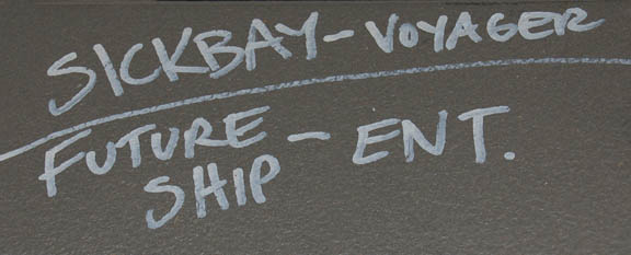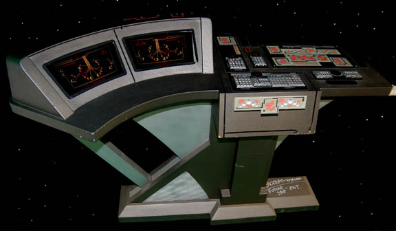 Description: A large, freestanding set piece remaining from the Star Trek: Enterprise episodes “Storm Front, Parts I and II” where the “Enterprise NX-01” crew returns to Earth from a harrowing journey only to find themselves trapped in the middle of an altered timeline of World War II. With alien help, the Nazis managed to take over parts of the eastern United States utilizing technology from that era mixed with alien experience. The aliens, known as the Na'kuhl, are attempting to return to their own timeline and have built multiple computer units, this being one of them. While the item appeared in various episodes of Star Trek: Voyager as part of the sickbay set, it has been repainted and outfitted with new acrylic ‘display screens’ and interface panels. The item features two backlit screens with Voth alien iconography, a series of button panels with spring back buttons all featuring alien character lettering, multiple flashing lights powered by a single 9volt battery activated by a switch mounted on the underside with power still remaining from production use, a second set of top mounted lighting exists and is also powered by an additional 9volt battery which does not have an external switch, and an inscription on the base reading ‘Sickbay-Voyager, Future Ship-ENT’. Additionally the item features multiple Voth themed graphical applications. The item is on casters and rolls easily from one place to another, the backlighting for the ‘screens’ are powered by a single cable with a standard American type-A three pronged 120voly plug. The item measures approx. 68 X 46.5 X 27 inches.