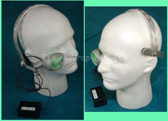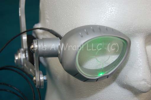 Description: A prop item featured in the Star Trek: Enterprise episode “Rogue Planet”; wherein “Captain Archer” (Scott Bakula) sees a mysterious humanoid figure on planet eternally engulfed in night. This item is for wear by Linda Park in the role of “Ensign Hoshi Sato” and is one of the night vision eyepieces used on the planet; it is a silver-colored, plastic eyepiece with a crosshair silkscreened upon a piece of clear acrylic, on a revolving pivot that features a switch an activation switch for a green light. The eyepiece is attached to a metal headpiece with a headphone on the right side and rubber cushioning on the other. A wire plugs into the eyepiece and connects to a battery pack that houses one nine-volt battery with three switches on it labeled “L”, “M”, and “H”. The item measures approx. 7 X 7 X 6 inches and had the name “Hoshi” written next to the headphone.