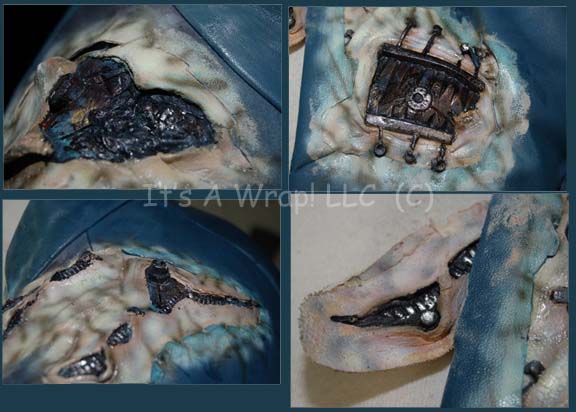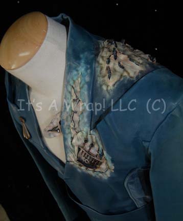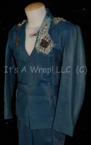 Description: A Tarkalean costume that has been partially assimilated by the Borg featured in the Star Trek: Enterprise episode “Regeneration”. Their costume is teal simulated leather trousers with blue accents and black elastic stirrups and suspenders with a matching top jacket and belt. The costume is distressed around each shoulder and on the left breast has been ‘torn’ open to reveal the onset of Borg assimilation whereby there are exposed special effects applications of pale ‘skin’ with Borg implants. The uniform also has a sewn on metal badge and a matching belt. The sewn in Enterprise tag reads ‘Mark Chadwick’ and the costumer’s tag reads ‘Enterprise #049 “Regeneration” Mark Chadwick, Male Tarkalean’.