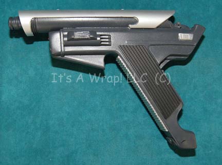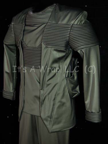 Description: A Mazarite soldier costume with a corresponding prop energy pistol featured in the Star Trek: Enterprise episode “Fallen Hero”. The costume is a set of iridescent green vinyl trousers with tubing added at the knees and a matching uniform jacket with an asymmetrical front and tubing accents. The jacket also features a sewn on holster for a Mazarite specific prop hand gun. The pistol is high quality cast resin painted charcoal with metallic silver colored accents, with an acrylic inset disk in the front under the firing tip, and an extremely non-invasive crack on the left side of the hand grip. The item measures approx. 9.5 X 6.25 X 1.5 inches. The sewn in Enterprise tags read ‘John Richards #023’ while the costumer’s tag reads ‘Enterprise #023 – Fallen Hero, Mazarite Soldier, John Richards’.