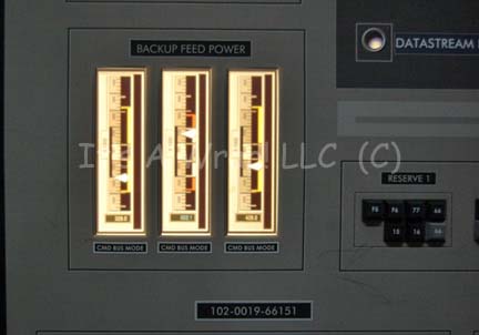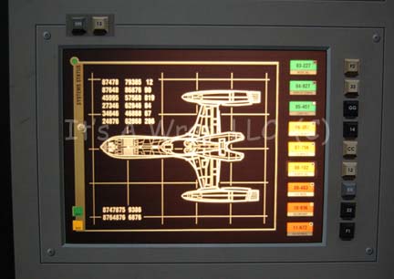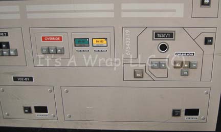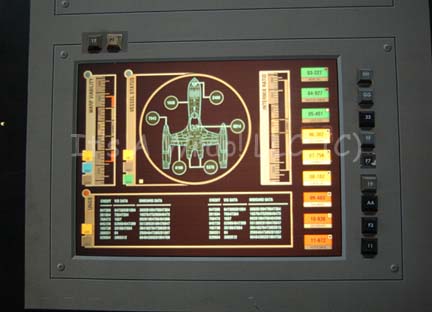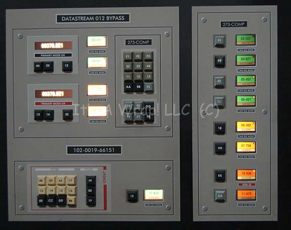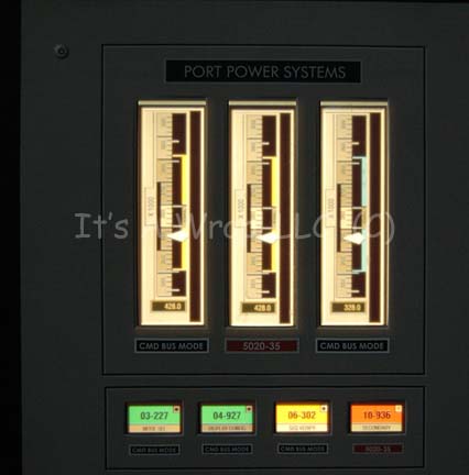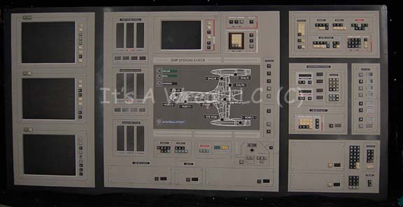 Description: A large acrylic panel featured in the Star Trek: Enterprise episode “First Flight”. The item was part of the set created as the Mission Control Center at Starfleet Headquarters during the testing of the “NX-Beta” warp 2 engines. The panel front features a graphical application with multiple openings for backlit details to shine through, multiple faux rubber buttons, and detail lines meant to depict depth. The item features three ‘display screens’ visible when back lit which depict various gages, displays, and readouts. A trio of static gages in the center board are labeled separately as ‘Port Power System’, ‘Starboard Power System’, and ‘Backup Feed Power’, they are positioned left of a large graphic of the ‘NX Beta’ which has multiple points of interest selected where an indicator light can shine through. The right side of the item depicts several other displays, gages, and indicators. The reverse of the item retains several places where lights were previously affixed to a small box that was adhered to the graphic itself thus allowing a single indicator light on the front to appear to be flashing. The item features multiple screw holes for wall mounting and measures approx. 96 X 48 inches.
