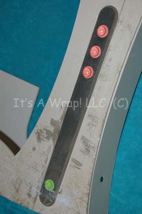 Description: A piece of set dressing similar to those featured in various episodes of Star Trek: Enterprise including “Impulse”. This item is a computer console from the Vulcan starship “Seleya” whose crew were driven mad by the toxic effects that trellium-D has on Vulcans; it is composed of plastic and wood components and features raised black console details with a variety of colored rubber ‘buttons' adhered to the item. The item has been visibly distressed to match the interior of the ship and the state it is in and measures approx. 16 X 15 X 2.25 inches.