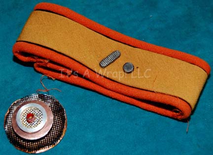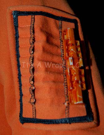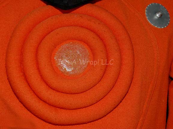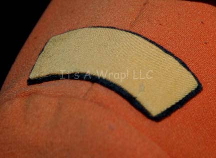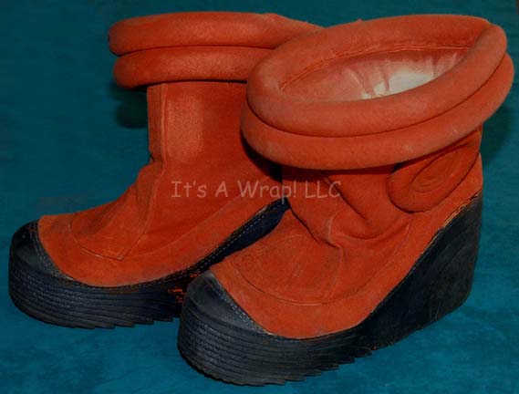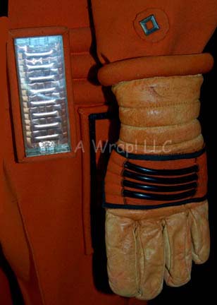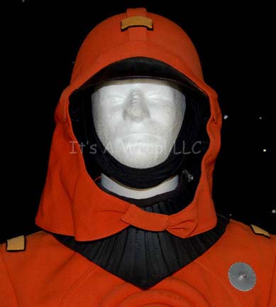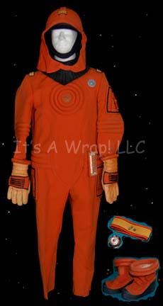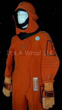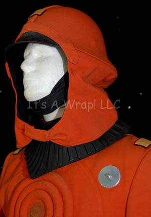 Description: An orange environmental engineer’s jumpsuit like those featured in Star Trek II: The Wrath of Khan, Star Trek III: The Search for Spock, and Star Trek IV: The Voyage Home. The costume is n orange jumpsuit with these attached elements, a pair of ‘thermal’ accents on the thighs and a differing one for the left sleeve, all missing black tubing, a pair of yellow engineering division strips on the shoulders, a silver colored metal breath mask attachment on the left breast, a reflective copper colored accent on the waist, a silver colored metal badge on a rank placement on the left sleeve indicating the wearer to be an ‘able seaman’. The costume also comes with these unattached elements: a matching cloth covered helmet with a yellow division strip on the forehead, a pair of gloves that feature black tubing ‘thermal;’ accents on the back of the hand, matching orange boots, an orange trimmed yellow division strip for the left forearm sleeve with a silver colored metal commendation bar and a matching ‘five year service’ pin, and a copper colored metal center chest accent, and a black foam rubber ribbed collar. Item Number