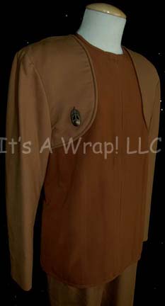 Description: A costume featured in various episodes of Star Trek: Deep Space Nine. This costume is that of a member of Bajoran security officer; a long-sleeved, tan uniform jacket featuring brown shoulders, Velcro patch for a commbadge (included but unattached), a zip down the front, an earring of the Bajoran-style, matching overall-style trousers with stirrups for the feet, tan, leather chunk-heel boots, phaser and tricorder holster. A sewn in tag on both reads ‘Deep Space Nine, Rudy Morrison’ and the costumer’s tag reads ‘Rudy Morrison, Joe Figueroa, Bajoran Security, DS9’.