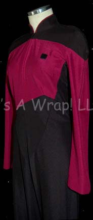 Description: A costume featured in various episodes of Star Trek: The Next Generation and Deep Space Nine. This costume is a long-sleeved, full-length Starfleet, black uniform jumpsuit featuring Command Red division colors across the chest, back, sleeves and collar piping; a Velcro patch for a commbadge (not included), a zip down the front and stirrups for the feet. A sewn in tag reads ‘Deep Space Nine, Stacy Schifino’ and costumer’s tag reads ‘TNG, Red, #162, 36’.