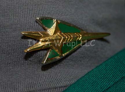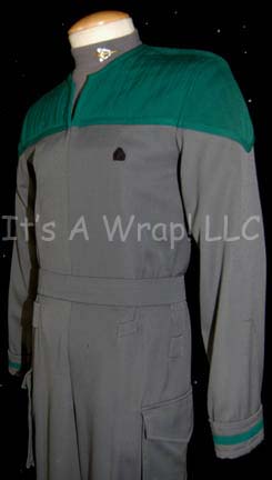 Description: A costume featured in the Star Trek: Deep Space Nine episode “Valiant”; wherein “Jake Sisko” (Cirroc Lofton) and “Nog” (Aron Eisenberg) are rescued from some Jem’Hadar by the Starship “Valiant”, a Defiant-class ship manned completely by members of the elite Red Squad cadet group. This costume is the Starfleet cadet’s uniform consisting of a long-sleeved, full-length, gray jumpsuit featuring quilted shoulders with Sciences Blue division colors and further division strips around the cuffs; a Velcro patch for a commbadge (not included) on the left breast, hoops for tools on the waist, pockets on the legs, a matching belt, stirrups for the feet, and a gray-blue, long sleeved undershirt with the Red Squad pin on the left side. A sewn in tag on the jumpsuit reads ‘Deep Space Nine, Charlie Price’, the tag on the undershirt reads ‘Deep Space Nine, 38, C. Price’, and the costumer’s tag reads ‘Charlie Price, Blue, Ensign, Cadet, DS9’.