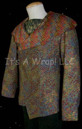 Description: A costume featured in various episodes of Star Trek: Deep Space Nine. The Vorta are the voice of “The Founders” and this costume consists of a long-sleeved, tunic featuring pleated shoulders, a dark-green zigzag pattern on a yellow-green background, dark-green boucle, overall-style trousers with stirrups for the feet; a long-sleeved, wrap-around jacket with a multi-colored design of various shapes on the oversized collar, and another design of the same colors across the rest of the jacket. A pinned in tag on each item reads ‘Deep Space Nine, Iggy Pop’ and a costumer’s tag reads ‘DS9 #534, Yelgrun (Vorta), Iggy Pop’.
