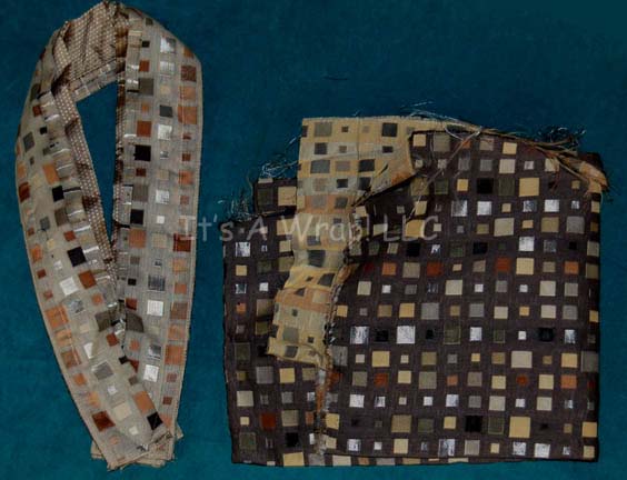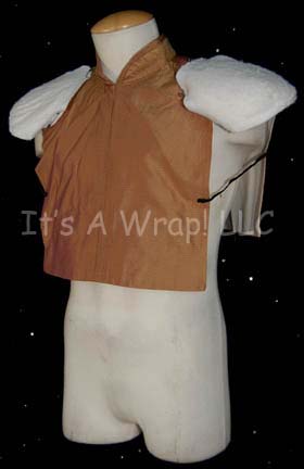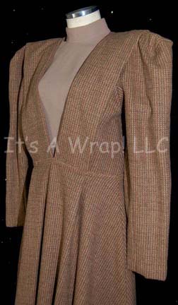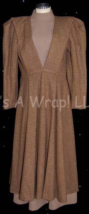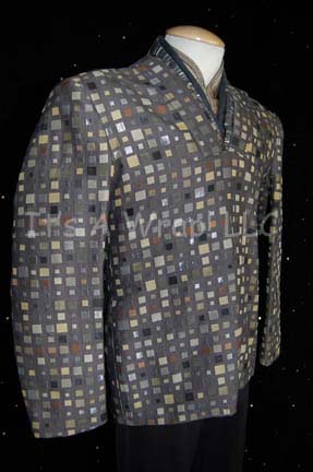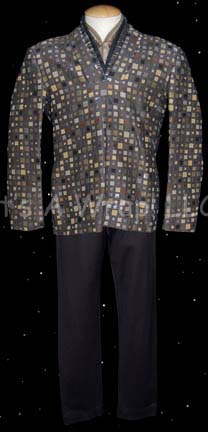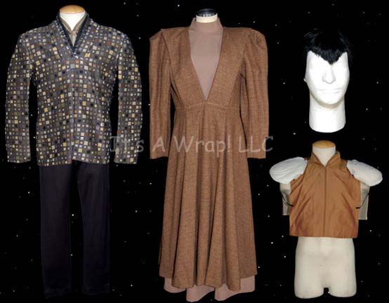 Description: A lot of costume items featured in various episodes of Star Trek episodic television. This lot consists of a long-sleeved, black Romulan field military jacket featuring a design of squares in various shapes and colors, a false collar of thin, staggered stripes in matching colors, a metallic copper-colored dickie, a gold-colored dickie with white dots, extra jacket fabric, an extra false collar, and a black, Romulan-style wig. Also included is a light-brown, full-length, sleeveless gown that goes under a slightly darker brown, long-sleeved, full-length dress with, multi-colored checks, and matching leggings. The Romulan field military jacket features a sewn in tag that reads ‘Enterprise, Guy Richardson #088’, the wig has a costumer’s tag that denotes it from “Nemesis” and for wear by Richard Irving’, and the dress’ tag reads ‘Star Trek: TNG, Miss C. Fortune.