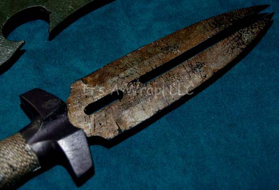 Description: A lot of two differing Reman style knives like those featured in Star Trek X: Nemesis for use by “Shinzon” (Tom Hardy). The items are high quality molded rubber with metallic green painted ‘blades’. The smaller one is styled for use during the scene in which Shinzon draws his own blood for sampling by the “Enterprise-E” crew, and appears near the end of the film when he uses one of this style during his fight with “Captain Picard” (Patrick Stewart). The larger knife is also of the style appearing in the same fight scene. The items measure approx. 14.75 X 3.75 X 1 inches and 9 X 2 X 0.75 inches.