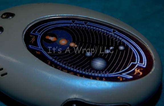 Description: A hand prop Andorian communicator like those featured in the Star Trek: Enterprise episode “Cease Fire”. The item is made from sturdy molded foam rubber with an iridescent blue sheen painted on the exterior. The item features four black painted faux buttons surrounding a white LED and an inset ‘display screen’ but the item does not feature any apparent lights or electronic capabilities. However, the ‘display screen’ does feature a graphic cut to fit that is situated between clear and opaque white acrylic plates. The graphic is translucent and capable of being backlit for greater visibility and it depicts an Andorian themed readout. The item measures approx. 5.25 X 3.5 X 1.25 inches.