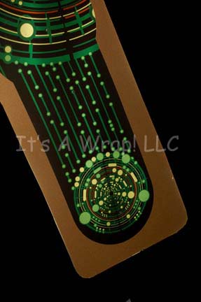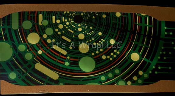 Description: A set piece featured in the Star Trek: Enterprise episode “Chosen Realm” for use in a console. The item is a piece of smoked acrylic with a translucent graphical application adhered to the reverse that appear when backlit to depict a series of static circular ‘interfaces’ that may have acted as faux buttons. The item is also adorned with a metallic bronze colored border on the front side. Speculation about the design of the graphic revolves around the possibility that the Triannon, the aliens who used the item at the top of the episode created it to reflect their religious beliefs about the Delphic Expanse spheres. The item has a slight curve to it, features pre, existing holes believed to have been placed there in the event that miniature lights were to be added to the item, and a degree of adhesive remains on the front due to time or storage conditions. The item measures approx. 34.75 X 7 inches.