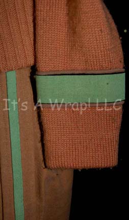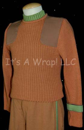 Description: A caramel colored medical officer's uniform featured in Star Trek V: The Final Frontier for wear by DeForest Kelly in his portrayal of “Dr. McCoy”. The costume is wool trousers with green division stripes down the outside seam of the legs, a pair of green sleeveless undershirts with ribbed collars, and a matching sweater with a green division strip around the left sleeve with remaining threads from a removed rank badge; a gold and silver colored badge indicating the wearer to be a ‘commander’ is included in the lot, the item has only one wire backing. Finally, a pair of size 11 men’s Reebok name brand thermal boots with dust still remaining in the quick fasten strips from production use are included. The boots represent the best of all remaining footwear for this costume configuration and are not character associated by any label or tag. The inner thermal lining is in good condition, but what’s more, the outer synthetic black portions are in good condition, all of the fastens are in working order, one on the left boot is broken but works, the ‘Reebok’ labels have been blacked out by marker or paint. The sweater features a sewn in Paramount tag reading ‘Kelly’, the undershirt features a sewn on Paramount tag with an illegible inscription but the zipper seam is inscribed ‘Kelly’, the second undershirt features a sewn in Paramount tag reading ‘Kelly’, the trousers feature a sewn on Paramount tag reading ‘Jim Halty, Sulu’; a sewn in name brand tag on the sweater is also inscribed ‘Halty’. This lot is the last known representation of “Dr. McCoy” field duty/commando costumes available that has not already been catalogued.