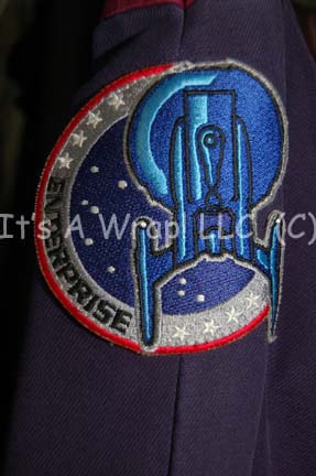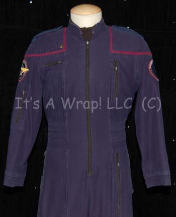 Description: A costume featured in the finale of Star Trek: Enterprise and truly Star Trek episodic television as a whole, “These Are The Voyages…”; wherein “Commander Riker” (Jonathan Frakes) runs a holodeck program of the last voyage of the “Enterprise NX-01” before the charter for what would become the United Federation of Planets is signed. This costume is a standard 22nd century Earth Starfleet uniform consisting of a full-length, long-sleeved, blue jumpsuit with seven functional, zipped pockets, Command Gold division strip, matching shoulder epaulettes, zipper/Velcro cuff adjustment for the wrists and ankles, Enterprise patch on the left shoulder, the Starfleet “Ad Astra Per Astria” patch on the right shoulder, one single pip denoting the rank of Ensign, and a long-sleeved, black undershirt. Both items feature sewn in tags that read ‘Enterprise, Glen Hambly’.