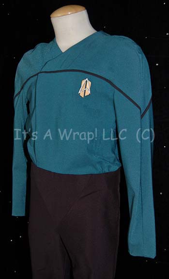 Description: A costume featured in the series finales of both Star treks: The Next Generation and Voyager. This costume is a future Starfleet uniform consisting of a long-sleeved, full-length, jumpsuit in Sciences Blue, a false, wrap-around style, a black horizontal piping across the front, black trousers with stirrups for the feet, Velcro patch for the future style commbadge (included but unattached), and a zip up the back. A costume tag reads ’51 Voyager, #748, Starfleet, Lou Simon’