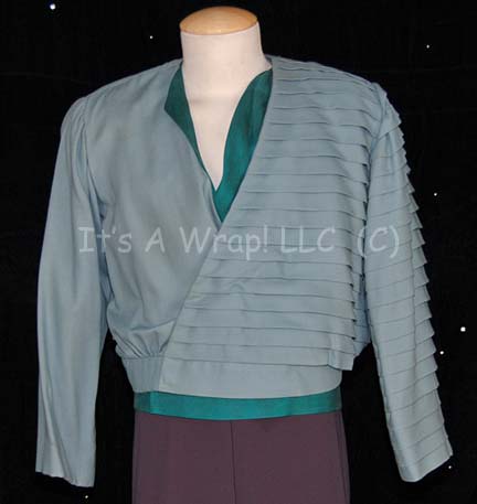 Description: A lot of costume items featured in Star Trek: The Next Generation episodes like “Family” .This lot is for wear by Patrick Stewart and consists of a long-sleeved, loose-fitting, green, silk shirt in the equestrian jersey-style with an open front that snaps along the bottom, and rolled up sleeves; an aqua-colored, long-sleeved shirt featuring a wrap-around front, v-shaped neckline, and large, horizontal pleats along the left side, and dark blue trousers with a gray tint to them. A costumer’s tag reads ‘Picard, Patrick Stewart, civilian shirt-lt. blue, pleated’ and another reads ‘#178 Family, Picard, Patrick Stewart, shirt-grn silk’.