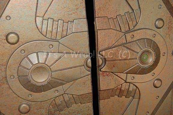 Description: A pair of vacuum formed wall panels with wood frames featured in multiple Star Trek: Enterprise episodes including “Impulse” and “The Council”. The items are wall panels that appeared in the Vulcan ship “Seleya” and in “Commander Dolim’s” (Scott McDonald) Xindi-Reptilian ship. The panels are vacuum formed plastic with wood frames painted to appear metallic gold, and bronze textured. They measure approx. 27.75 X 48 X 3.5 inches where they are raised for dimension.