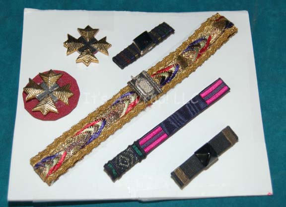 Description: A flag admiral's rank badges, strip, and campaign ribbons featured on a rear admiral in the Starfleet Headquarters sequence in Star Trek VI: The Undiscovered Country. The badges are silver and gold colored metal, one is affixed to a red placement for the left costume forearm sleeve, antique multi-colored ribbon and gold lace with a single fabric lozenge to further indicate rank is worn on the same sleeve, and a trio of variously sized campaign ribbons are present, multi-colored with various metal embellishments. A gold colored string is accompanying for attachment to the front of the uniform jacket.