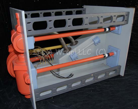 Description: A busy box like those featured in Star Trek: The Original Series, created for the Star Trek: Enterprise episode “In a Mirror, Darkly: Parts I and II”. The item is a large fashioned wood prop with PVC tubing, painted in the color scheme of The Original Series “Starship Enterprise”. The front of the item represents an access to conduit and ship’s systems that would technically be behind a bulkhead. The item also features a series of rubber tubing and connection leads to suggest hardware. It measures approx. 30 X 25 X 48 inches.