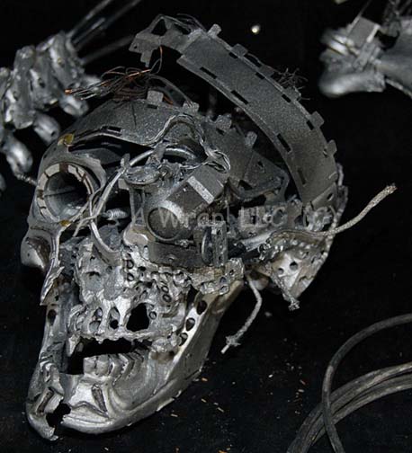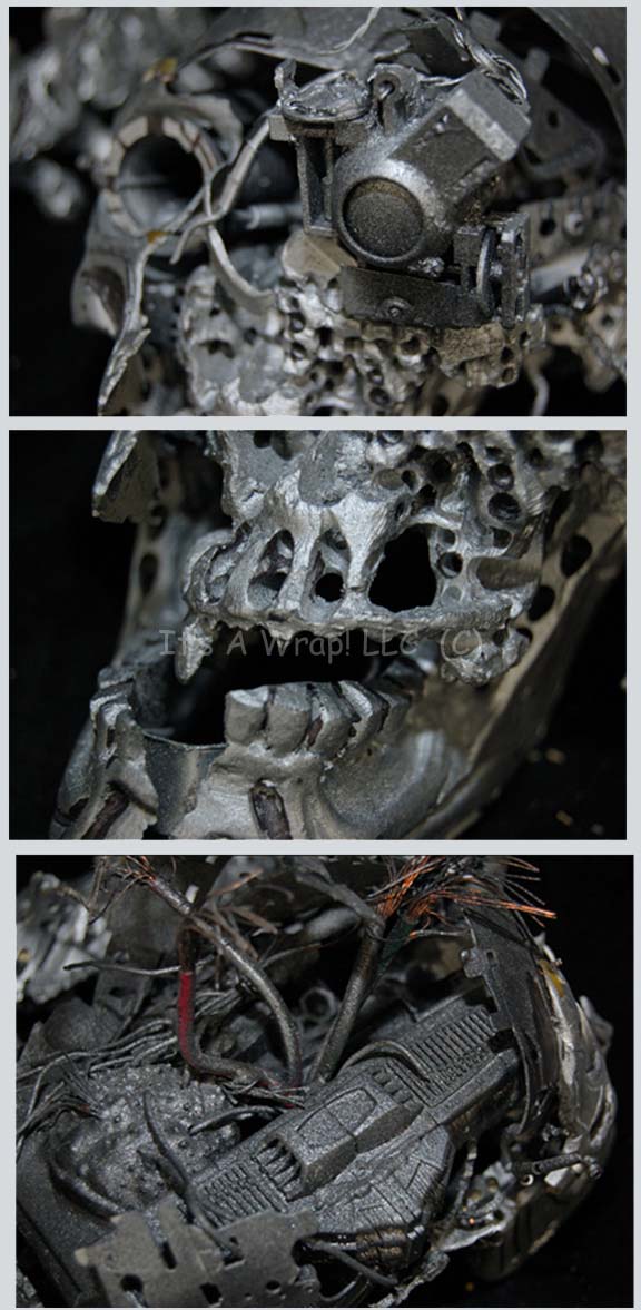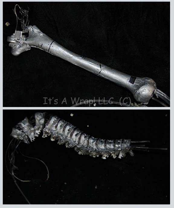 Description: A lot of Borg ‘bones’ featured in Star Trek VIII: First Contact for use in scenes taking place during the dénouement of the film in the Engineering set. The items are molded resin ‘bones’ painted metallic silver with black adhesive detail lining for a ‘constructed’ appearance, with black nylon cord and metal spring to emulate ‘wiring’. The items represent a femur leg bone, a spine, and a high tech skull with multiple impressive elements added to suggest hardware. The items are distressed to appear ‘savaged’ and ‘torn apart’. The jaw bone is split up the center and both pieces have a degree of movement, several other pieces are loose, but fixed to the item. The spine measures approx. 16 inches long, the skull 10 X 5 X 6 inches, and the femur 12 inches long.