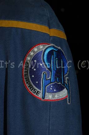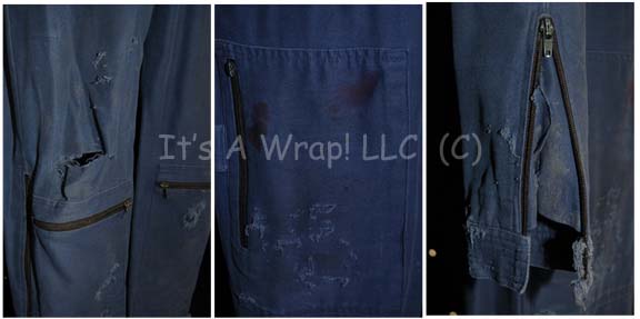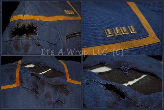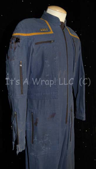 Description: A distressed Starfleet uniform featured in the Star Trek: Enterprise episodes “Zero Hour” and “Storm Front, Part I” for wear by Scott Bakula in his portrayal of “Captain Archer” in perhaps his greatest character moment of the series. The item is a blue Starfleet uniform with command gold division stripes around the shoulders, with the famous “Enterprise NX-01” assignment patch sewn onto the left shoulder, corresponding rank, and a black button front long sleeved undershirt. The costume features all the regular accoutrements including zippered pockets and, size adjusting sleeve cuffs and ankles, and ‘away team’ gear loops sewn onto the right hip, but it is also distressed from Captain Archer’s battle with the Xindi-Reptilian, “Commander Dolim” (Scott McDonald) in the climax of “Zero Hour”. The costume is generally distressed to appear, ripped, torn, thrashed, ‘bloody’, and stained. Points of significance include a tear across the right shoulder where additional fabric was sewn in to fortify the location from further ripping, the tear is stained with special effects ‘blood’; the size adjusting cuff on the right sleeve is completely ripped out, a visible hole is present in the right knee, and most notably, three slashes are present across the back between the shoulder blades where Dolim scratched Archer in their battle. The scratched are stained with special effects ‘blood’ and the scratches go through the undershirt as well. The undershirt appears to have had a sewn in tag at one time but it has been removed, the uniform has a sewn in Enterprise size and number tag that is not marked, no other sewn in tags are present. A costumer’s tag reads ‘Archer, Scott Bakula, #, Starfleet Uniform, Distressed’ and to be completely clear costumer’s tags are not sewn in tags. The rank pins attached to the uniform were added in the exact spots where previous rank pins were attached as per visible holes and the current rank was located separately of the uniform, they are of the gold colored metal variety that is part of the Enterprise rank collection.