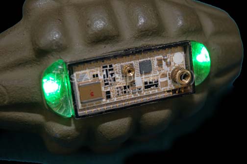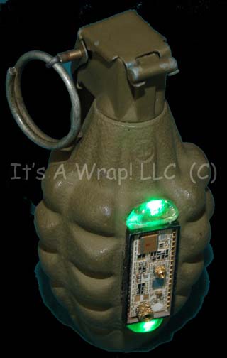 Description: A prop item featured in the second half of the two part Star Trek: Voyager episode “The Killing Game:’ wherein the Hirogen take over “Voyager” and put her crew through various holodeck simulations including one where they play resistance fighters during World War II. This item is the familiar pineapple-shaped grenade first used during WWII and through Vietnam, it is molded metal body, pin and handle but featuring an additional piece of faux circuitry on the base that illuminates with two blinking lights when the pin is pulled. The item still retains power from production use and measures approx. 5 X 2.5 inches.
