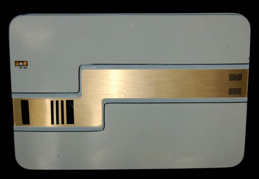 Description: A 24th Century style Starfleet Personal Access Display Device (PADD). It was presumably used on one of the 24th Century series and/or feature films including Star Trek: The Next Generation, Deep Space Nine or Voyager. The PADD is plastic painted silver with an LCARS style inset multicolored display screen that reads “Planetary Geology – 55364”. Attached to the PADD are numerous applications creating faux buttons and detail. The front of the PADD has become loose where the PADD bows slightly in the middle. Measures approx. 16 x 11 inches.