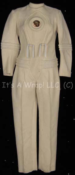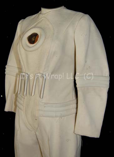 Description: A Starfleet engineer’s white radiological suit retaining to some degree its configuration for Star Trek I: The Motion Picture. The costume is a full length white jumpsuit with ribbing at the waist and elbows, and features an attached pair of silver colored metal ‘U’ shaped accents at the waist that would be rigging loops in the following Star Trek feature films. The costume also features a copper colored foil center chest accent that is affixed, but has lost the protruding element. Groupings of threads remain as evidence of removed items. The costume features these unattached elements for a depiction of Star Trek I: a pair of white gloves, a pair of red engineering division-rank strips for the shoulders with triangular gold thread accents indicating the wearer to be a ‘petty officer’. The costume also comes with these unattached elements to better complete it for further feature use: a black foam rubber collar to which some of the adhered ribbing aspects have begun to loosen (not pictured) , a pair of white gloves with black tubing ‘thermal’ accents, a pair of thickly black soled boots, a pair of yellow engineering division strips for the shoulders, a white bordered yellow division strip for the left forearm sleeve with a pair of silver colored metal ‘5 year service’ pins and a matching commendation bar, a white placement with an attached silver and gold colored metal ‘ensign’ rank badge, a metallic silver pin backed name badge with ‘STRAN’ etched into it, a silver colored reflective waist accent, a pair of black tubed thigh ‘thermal’ accents, and a similar one for the left shoulder. The costume also comes with a costumer’s tag reading ‘MacKing’.